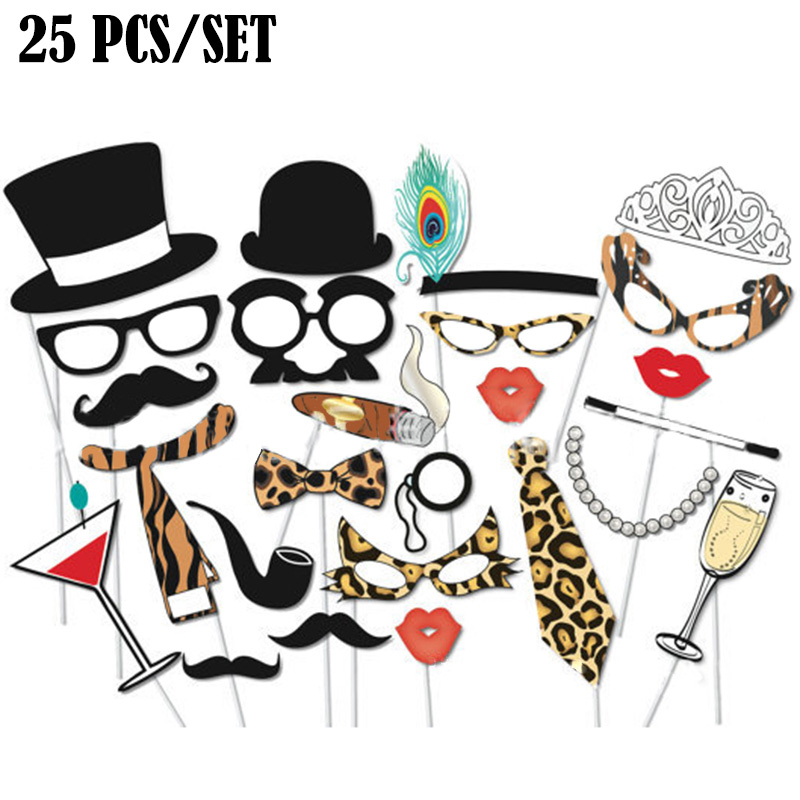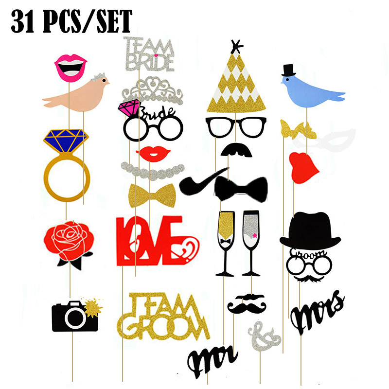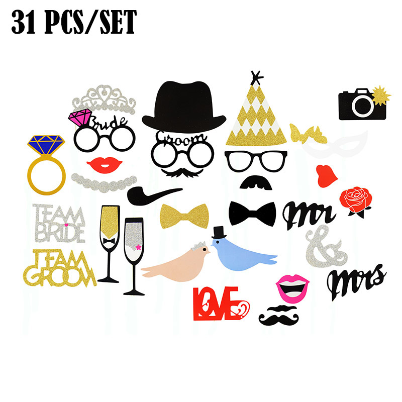 - 31 pieces of wedding party photo props, made by using very good quality, thick cardboard paper, and high end glitter sheet. Good quality wooden sticks and glue are also included in the pack.