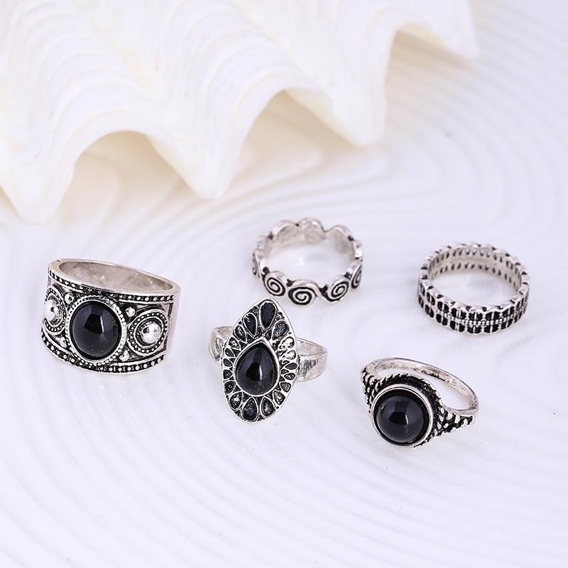 - It’s a set of five rings, all with different designs, two of them are simple metallic bands with a little designing on them, while the rest carry huge synthetic stones and gems in different shapes and are embedded with rhinestones. All five rings are in silver and black colors.