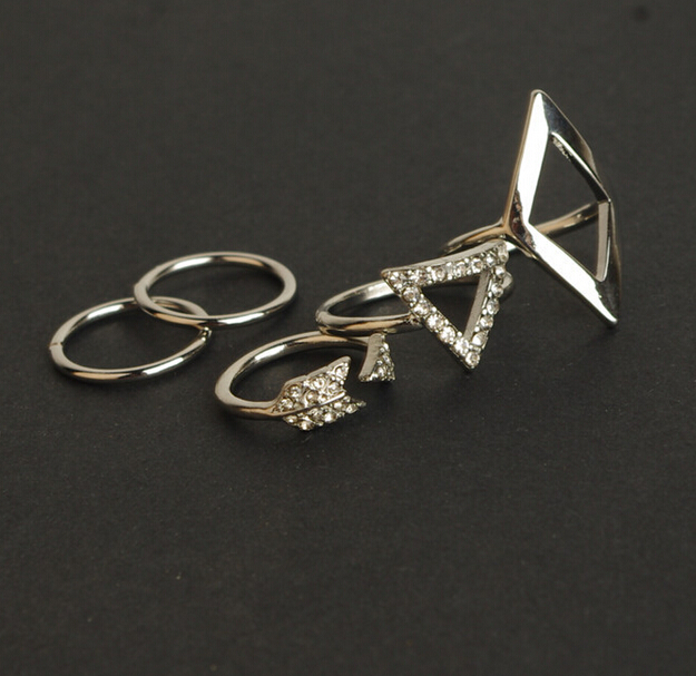 - This set includes 5 minimalist and geometrically designed beautiful rings. This set consists of two simple bands, one large simple golden diamond shape, one big gold triangle embedded with small rhinestones and one arrow shaped ring which is also gold and embedded with zircons.